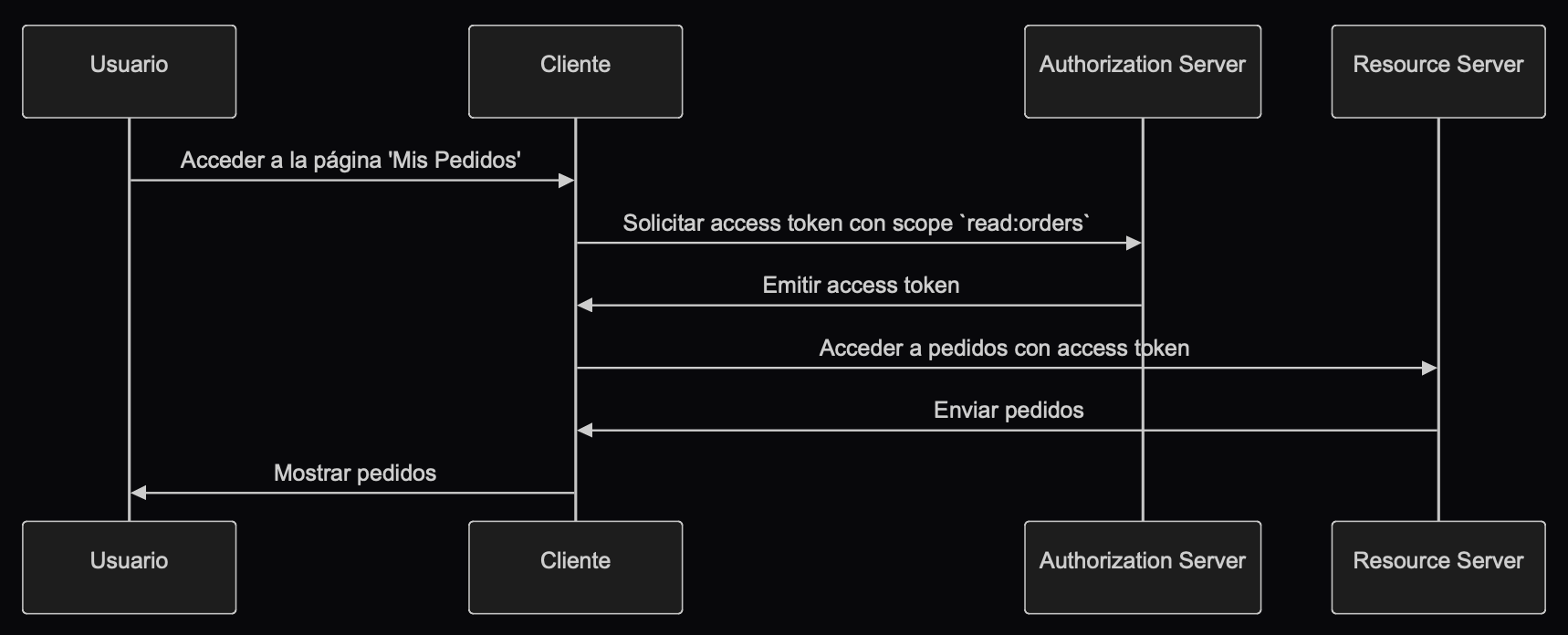 Por ejemplo, un usuario (sujeto) necesita acceder a sus pedidos (recurso) en un sistema de comercio electrónico. Al aprovechar OAuth 2.0, puedes definir un scope read:orders y una aplicación web (cliente) solicitará este scope desde el servidor de autorización. Aquí hay un flujo simplificado: